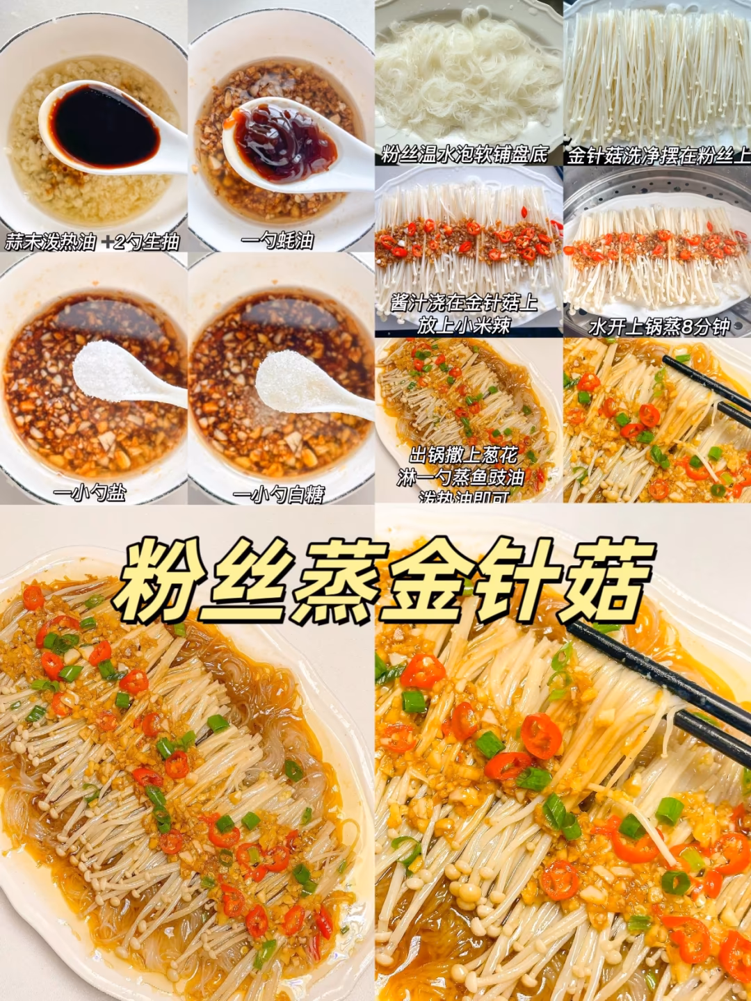 ✅第十二款:粉絲蒸金針菇 準備食材:粉絲、金針菇、蒜末、小米辣、蔥花 配料:生抽、蚝油、食鹽、代糖、蒸魚豉油